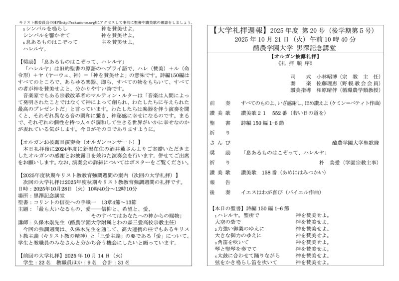 2025年度後学期第5回(2025年10月21日)大学礼拝・オルガン演奏会の案内