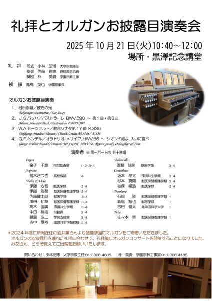 オルガン披露演奏会(2025年10月21日)の案内 Date:2025.10.15 オルガン演奏会(オルガン披露コンサート) 2024年度に新潟在住の酒井薫さんより酪農学園にオルガンをご寄贈いただきました。 オルガンのお披露目を兼ねた礼拝に合わせて、礼拝後にオルガンコンサートを開催することになりました。 みなさん、どうぞ覚えてご出席をお願いいたします。 詳しくは添付のポスターをご参照ください。 添付ファイル1 次の記事へ 記事一覧へ 前の記事へ