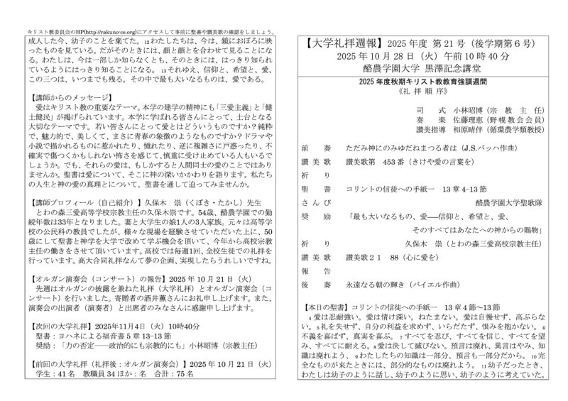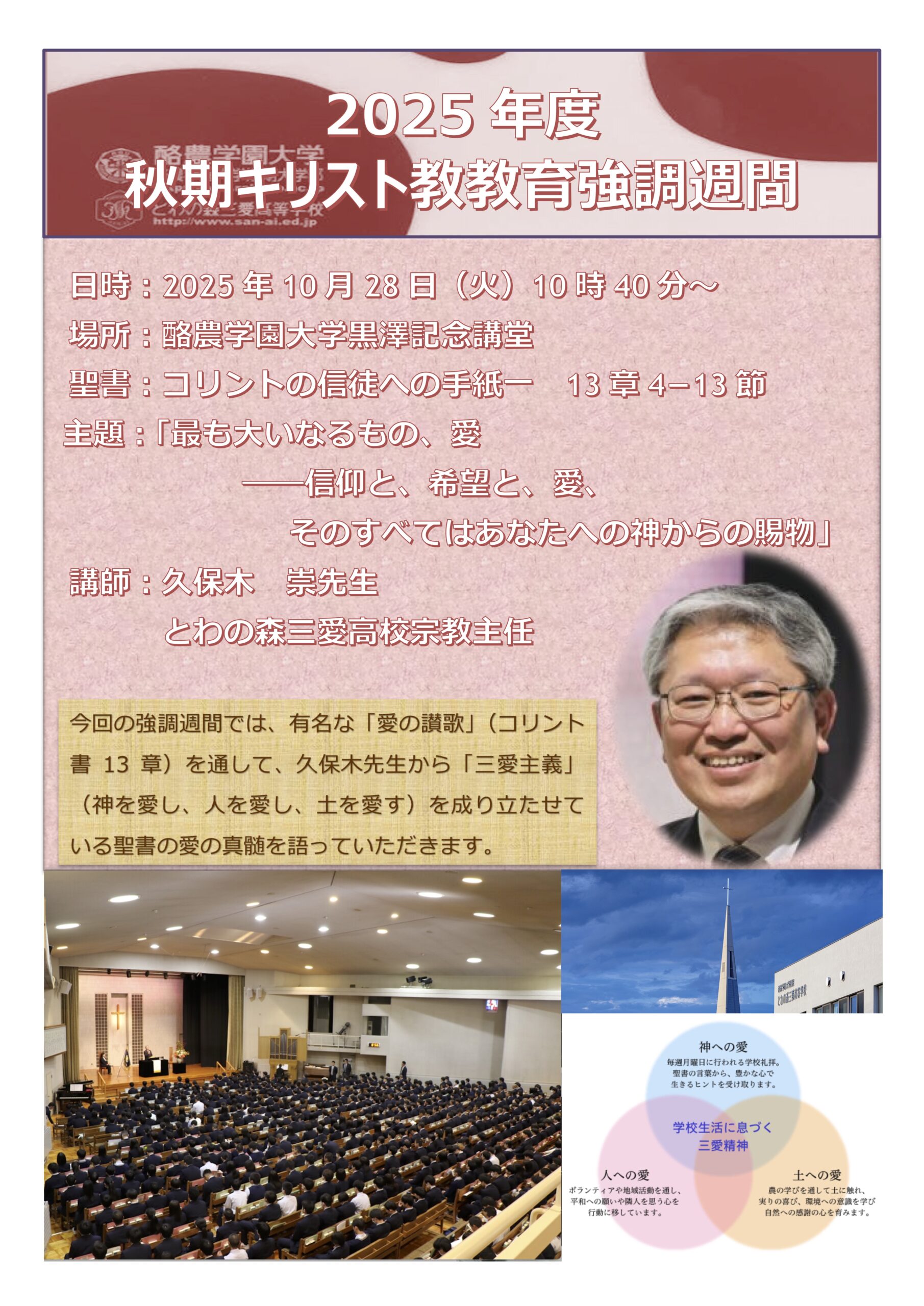今回の強調週間では、付属とわの森三愛高校の宗教主任の久保木先生から、酪農学園大学の建学の精神の中心にある「愛」の真髄を語っていただきます。