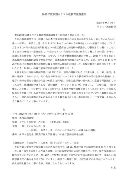 2025年度秋期キリスト教教育強調週間が下記の要領で行われます。学生、教職員のみなさん、こぞってご出席をお願いいたします。
