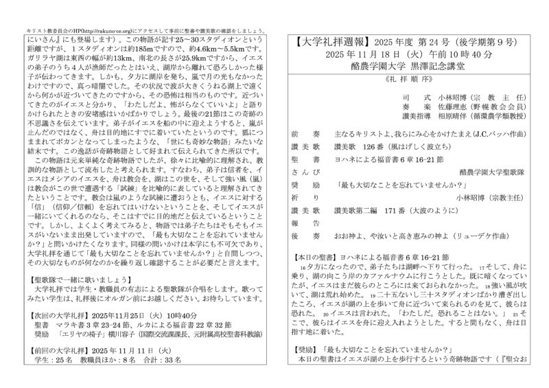 2025年度後学期第9回(2025年11月18日)大学礼拝の案内