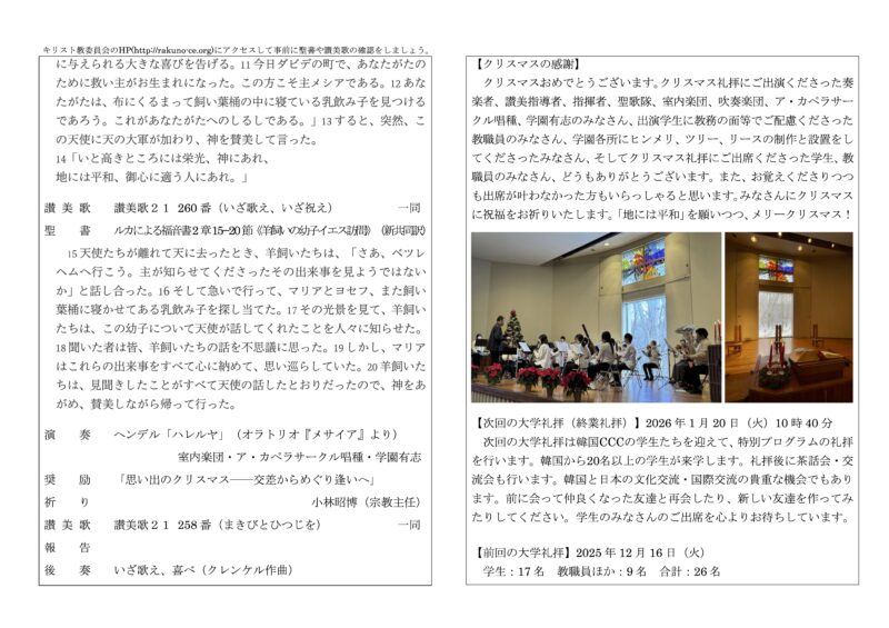 次回の大学礼拝はクリスマス礼拝です。各所のアドヴェント・リース、講堂壇上のクリスマス・ツリー、講堂ロビーのヒンメリからクリスマスの雰囲気が感じられます。今年は聖歌隊の賛美、室内楽団、吹奏楽団、、ア・カペラサークル唄種による演奏と合唱があります。キリスト教主義大学で自分自身の内面に向き合いつつ、平和を願うクリスマスを迎えてください。